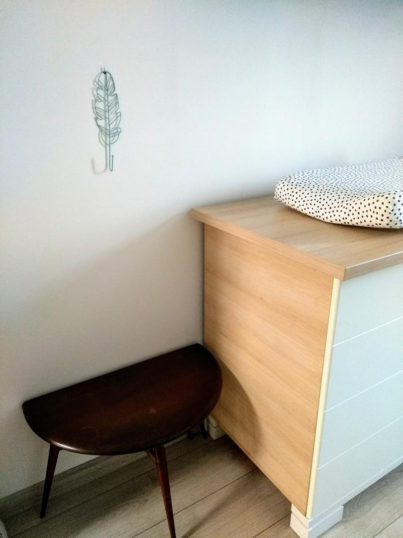 Verder kwamen er nieuwe gordijnen, een nieuwe lamp en kreeg de plank boven de commode een andere kleur. Het konijn aan de muur, het matching kussen op de stoel en de wasmand komen van wehkamp.nl. Het wolkje boven de stoel en het verenhaakje aan de muur zijn van Intratuin, het klaptafeltje is vintage en van mijn oma geweest. De comfy bruine stoel is ook een krijgertje en heerlijk om straks met de beeb in weg te kruipen om flesjes te geven β₯