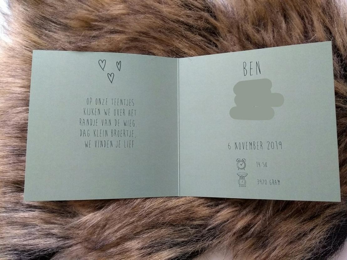 Olijfgroen en zwart waren de kleuren die ik graag wilde gebruiken. De pijl op de voorkant onder zijn naam maakt het stoer en het hartje rechts bovenin juist ook lief. Het versje aan de binnenkant slaat natuurlijk op Noor en Lot want ik wilde er wel iets voor zijn zussen erin zetten maar niet expliciet want het gaat hier om Ben. Ik kwam ergens in mijn zwangerschap een soortgelijke tekst tegen en past ‘m aan. Het versje in het kaartje: